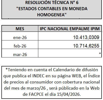 El día viernes 13 de marzo de 2026, la Federación Argentina de Consejos Profesionales de Ciencias Económicas (FACPCE), mediante la JG 539/18, publicó el índice para la aplicación de la Resolución Técnica N° 6 Y N° 54 del mes de febrero de 2026. Este índice se actualiza mensualmente de acuerdo con la serie del índice de precios al consumidor con cobertura nacional (IPC Nacional) publicado por el INDEC.