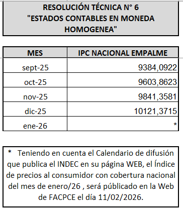 El día martes 13 de enero de 2026, la Federación Argentina de Consejos Profesionales de Ciencias Económicas (FACPCE), mediante la JG 539/18, publicó el índice para la aplicación de la Resolución Técnica N° 6 Y N° 54 del mes de diciembre de 2025. Este índice se actualiza mensualmente de acuerdo con la serie del índice de precios al consumidor con cobertura nacional (IPC Nacional) publicado por el INDEC.